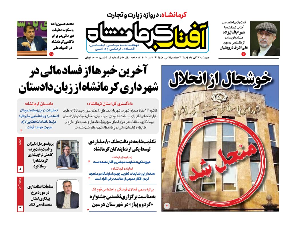 شماره جدید نشریه آفتاب کرمانشاه ، امروز چهارشنبه در 12 صفحه منتشر شد که تیتر نخست خود را به مطلبی با عنوان " آخرین خبرها از فساد مالی شهرداری کرمانشاه از زبان دادستان " اختصاص داده است.