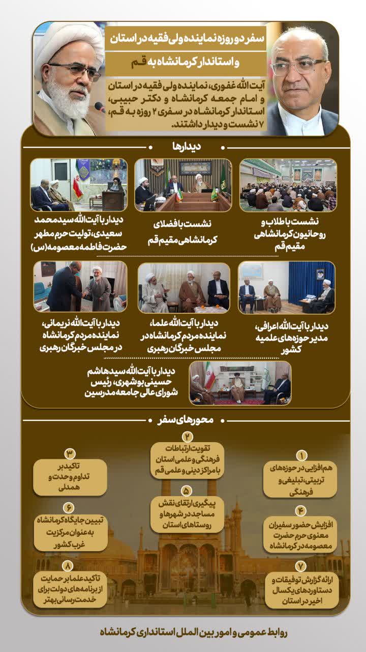 روابط عمومی استانداری کرمانشاه با طراحی جدولی مهمترین دستاوردهای معنوی !! سفر استاندار برتر کشور را به شهر قم و دیدار با حضرات آیات عظام و امام جمعه قم را اعلام کرد که از جمله آن می توان به " تبیین جایگاه کرمانشاه بعنوان مرکزیت غرب کشور " اشاره کرد.