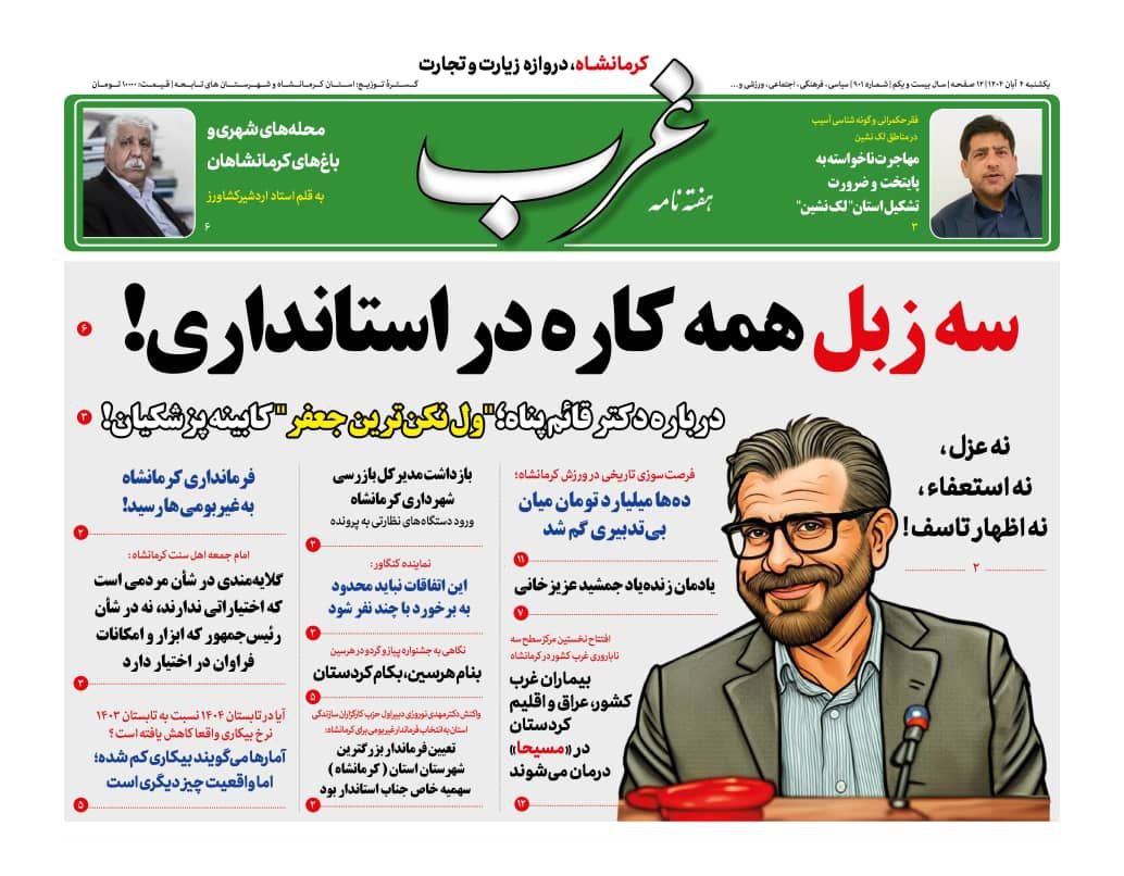 شماره جدید هفته نامه غرب ، امروز یکشنبه در 12 صفحه منتشر شد که تیتر نخست خود را به مطلبی با عنوان " سه زبل همه کاره در استانداری کرمانشاه " به قلم مهدی نوروزی فعال سیاسی اصلاح طلب اختصاص داده است.