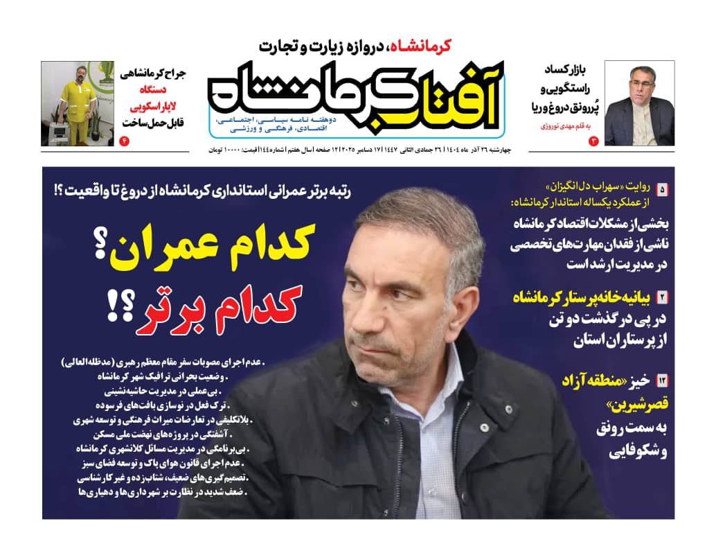 شماره جدید دوهفته نامه آفتاب کرمانشاه ، امروز چهارشنبه در 12 صفحه منتشر شد که تیتر نخست خود را به مطلبی با عنوان : رتبه برتر عمرانی استانداری کرمانشاه از دروغ تا واقعیت " کدام عمران ؟ کدام برتر؟! " اختصاص داده است.