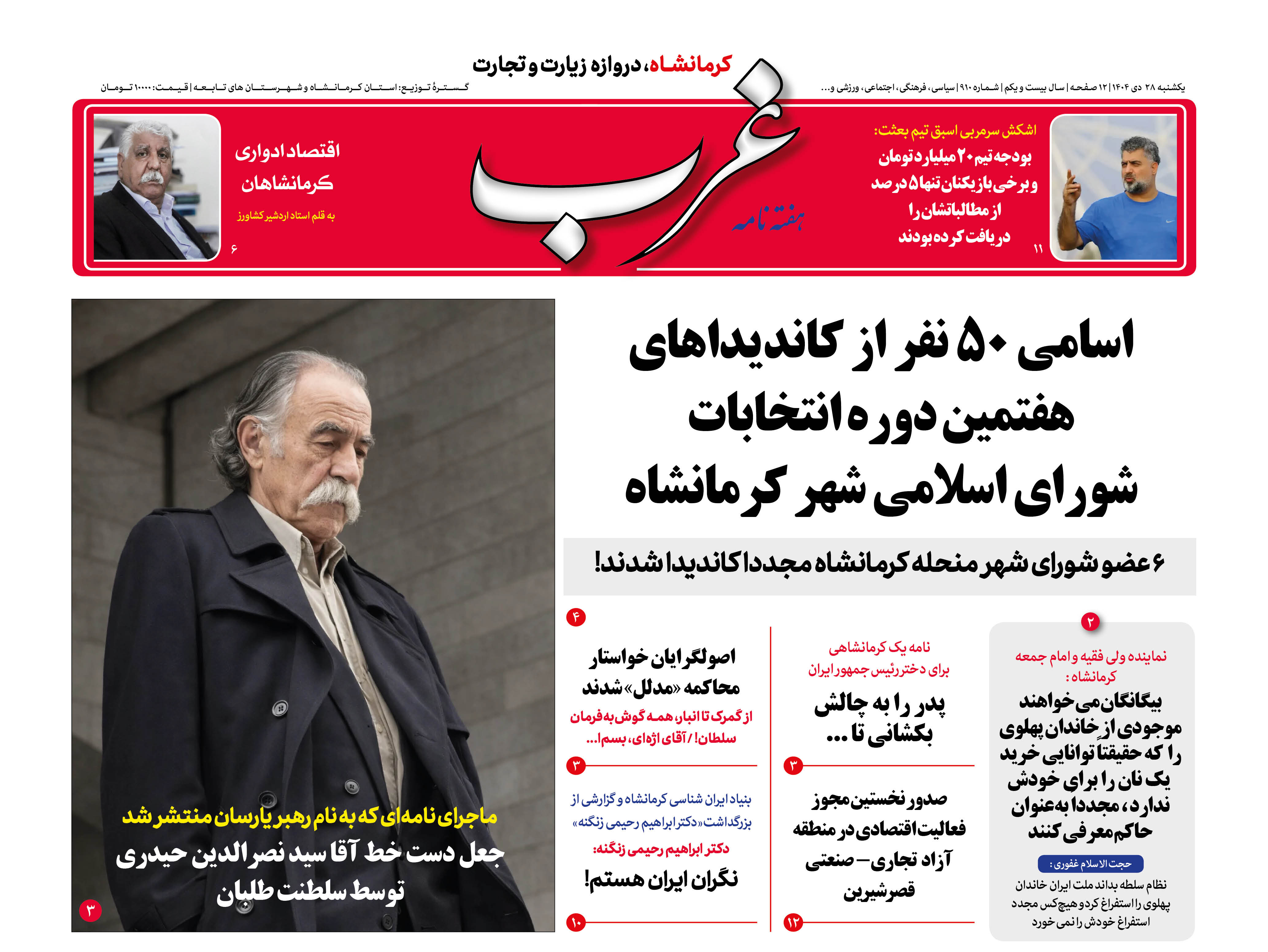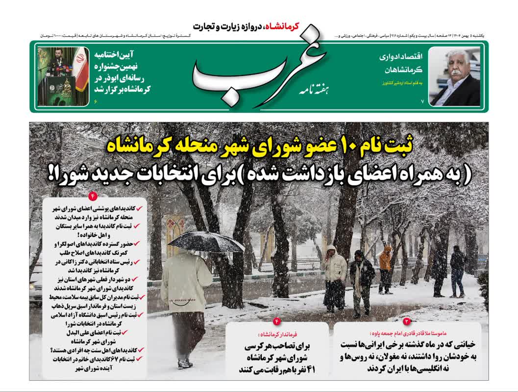 شماره جدید هفته نامه غرب ، امروز یکشنبه در 12 صفحه منتشر شد که تیتر نخست خود را به مطلبی با عنوان " ثبت نام 10 عضو شورای شهر منحله کرمانشاه ( به همراه اعضای بازداشت شده ) برای انتخابات جدید شورا " اختصاص داده است.