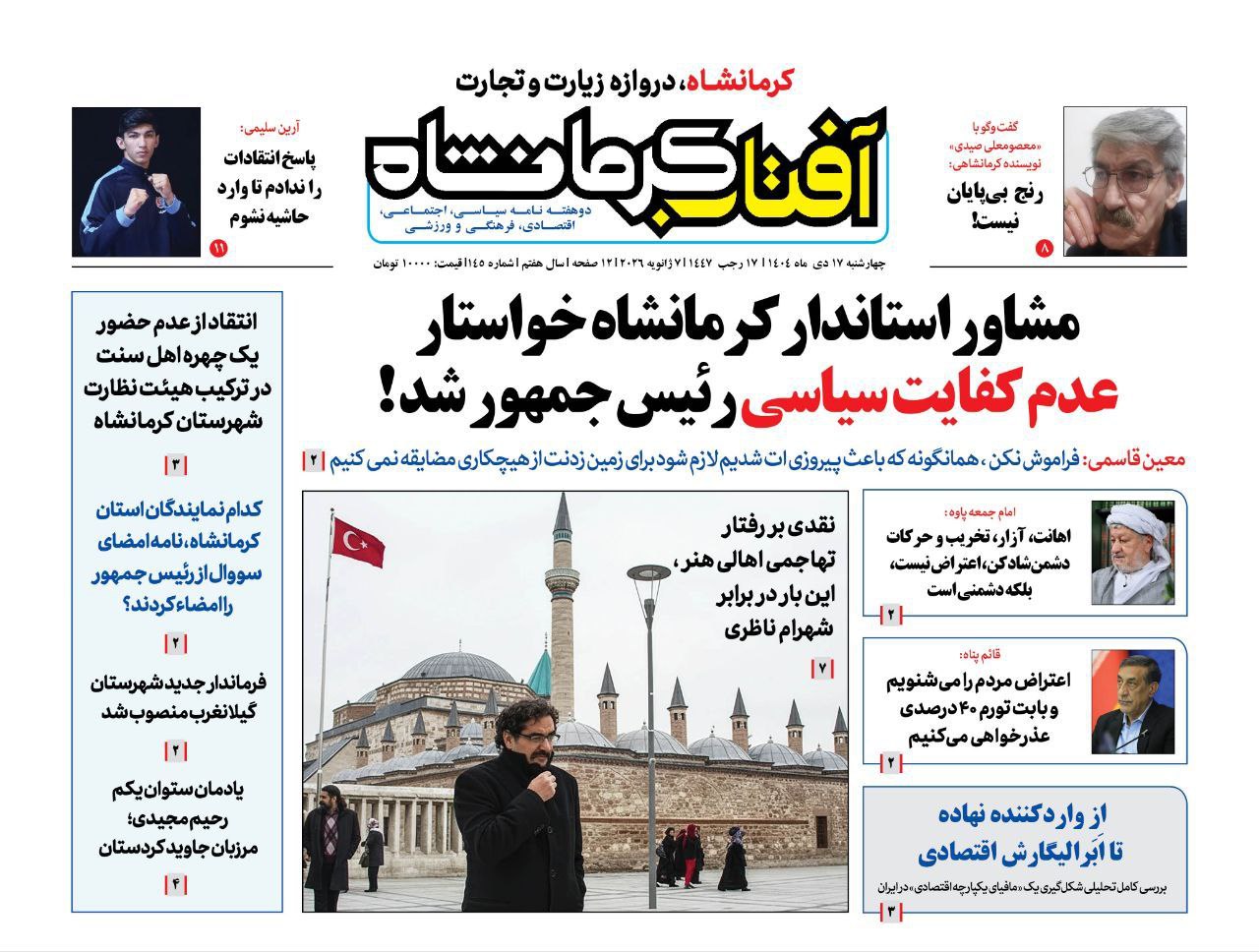 شماره جدید دوهفته نامه آفتاب کرمانشاه ، امروز چهارشنبه در 12 صفحه منتشر شد که تیتر نخست خود را به مطلبی با عنوان " مشاور استاندار کرمانشاه خواستار عدم کفایت سیاسی رئیس جمهور شد" اختصاص داده است.