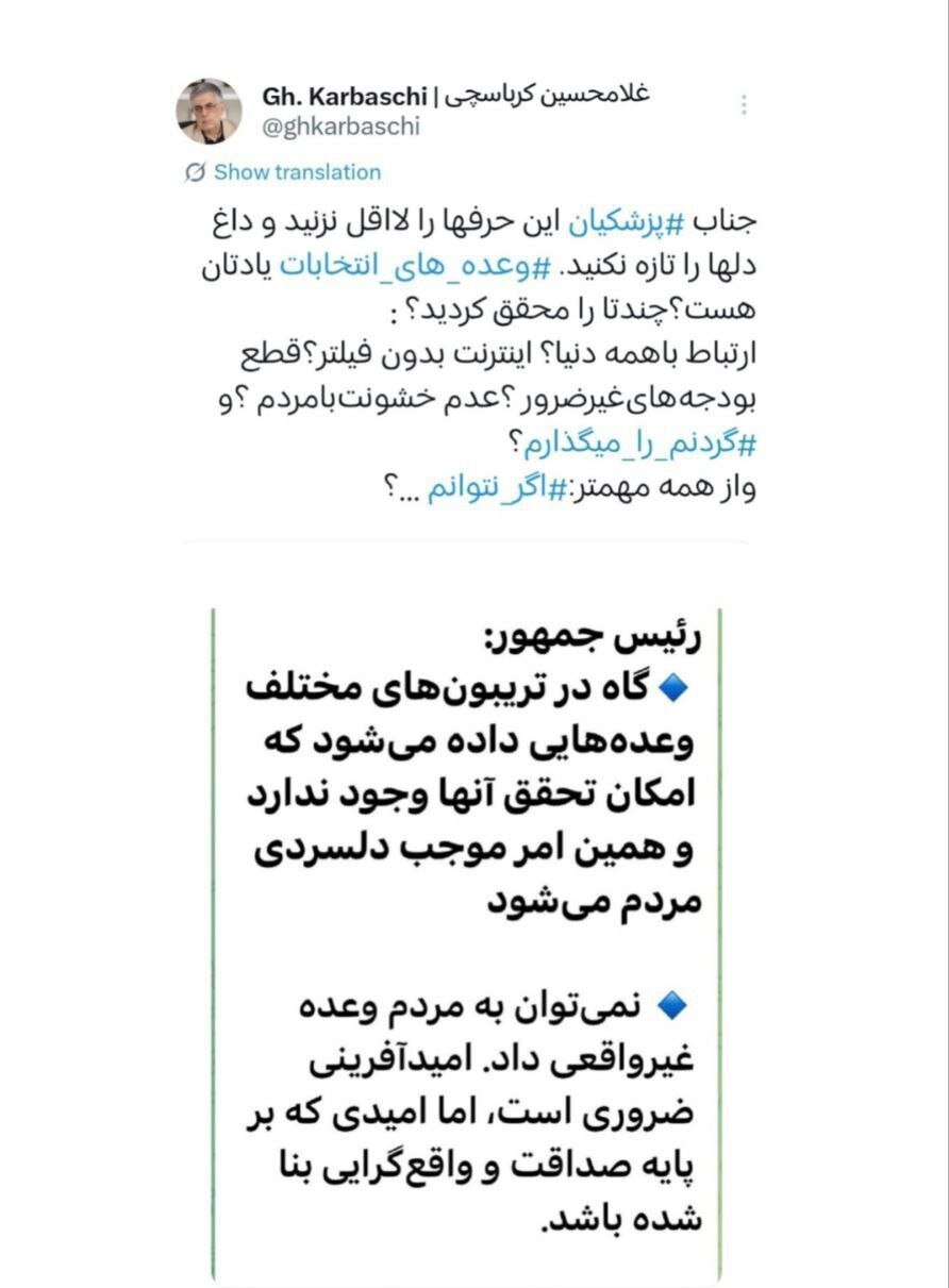 غلامحسین کرباسچی در واکنش به اظهارات پزشکیان مبنی بر اینکه نباید وعده‌هایی داد که امکان تحقق ندارد، نوشت: چند تا از وعده‌های انتخابات را محقق کردید؟