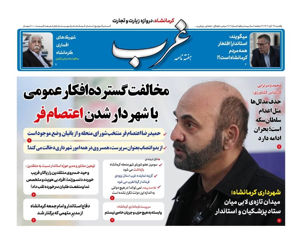 شماره جدید هفته نامه غرب ، امرو یکشنبه در 12 صفحه منتشر شد که تیتر نخست آن را به درج مطلبی با عنوان " مخالفت گسترده افکار عمومی با شهردار شدن اعتصام فر اختصاص داده است . همچنین در صفحه نخست غرب " توهین وحید خسروی مدیرکل حوزه استاندار به منتقدین و...." درج شده است.