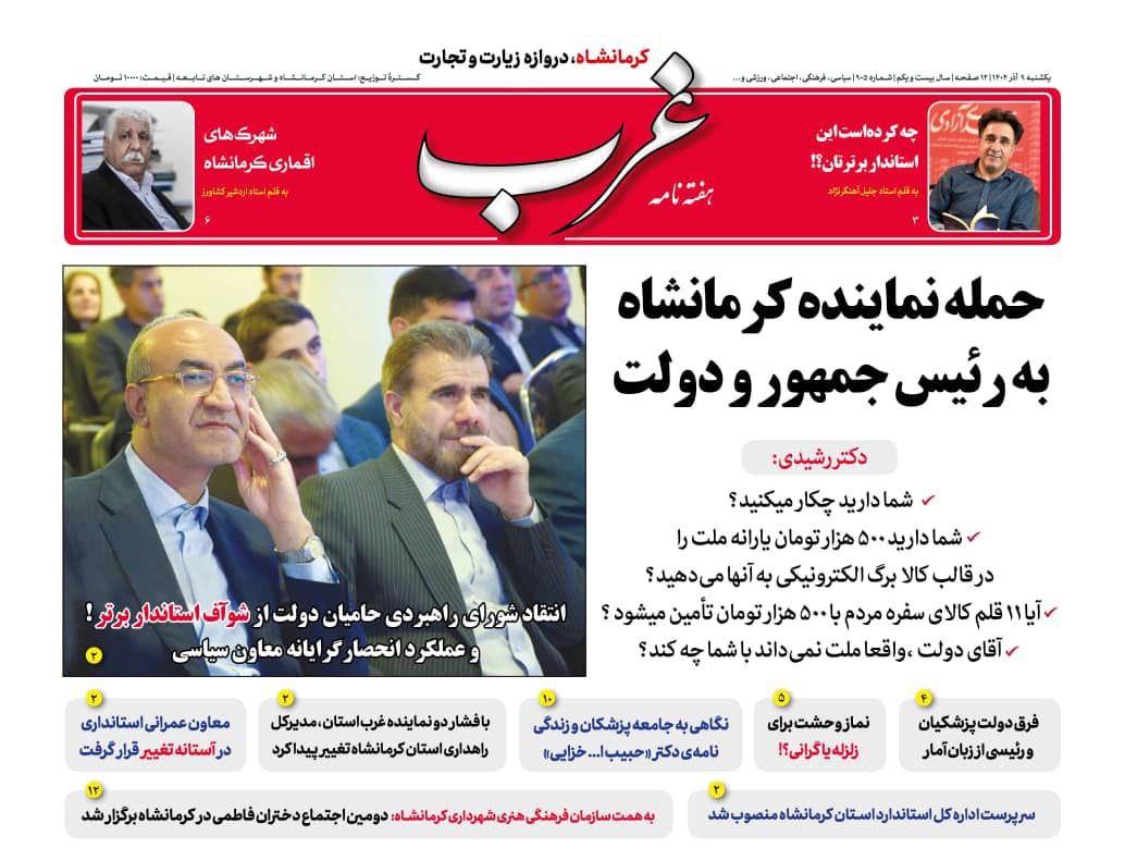شماره جدید هفته نامه غرب ، امروز یکشنبه در 12 صفحه منتشر شد که تیتر نخست خود را به درج مطلبی با عنوان " حمله نماینده کرمانشاه به رئیس جمهور و دولت "اختصاص داده که به نقل از دکتر رشیدی نوشته است" شما دارید چکار می کنید؟!