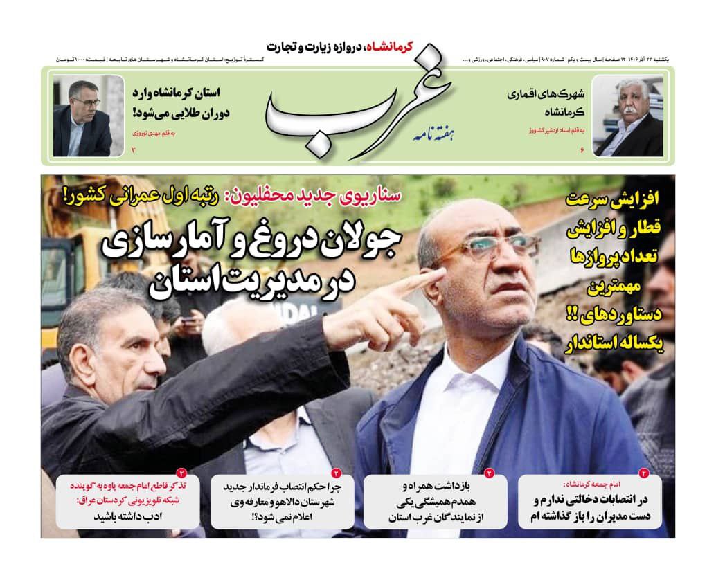 شماره جدید هفته نامه غرب ، امروز یکشنبه در 12 صفحه منتشر شد که تیتر نخست خود را به سناریوی جدید محفلیون استانداری کرمانشاه اختصاص داده و نوشته است : جولان دروغ و آمارسازی درمدیریت استان !
