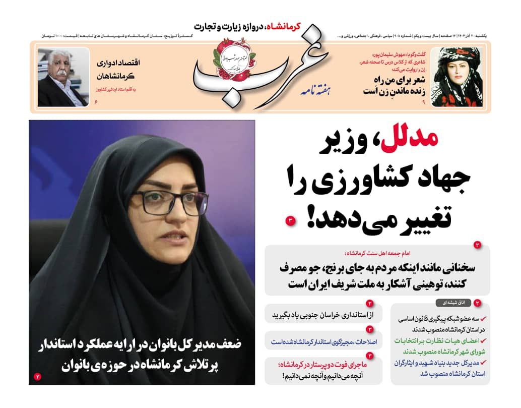 شماره جدید هفته نامه غرب ، امروز یکشنبه در 12 صفحه منتشر شد که تیتر نخست خود را به مطلبی با عنوان " مدلل ، وزیر جهادکشاورزی را برکنار می کند!" اختصاص داده است.