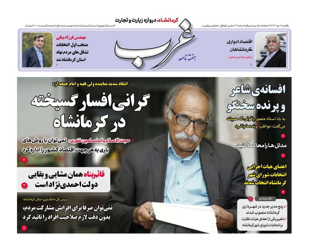 شماره جدید هفته نامه غرب ، روز یکشنبه در 12 صفحه منتشر شد که تیتر نخست خود را به درج انتقاد نماینده محترم ولی فقیه و امام جمعه کرمانشاه از گرانی افسار گسیخته در کرمانشاه اختصاص داده است.