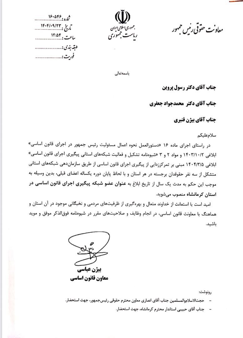 طی حکمی از سوی معاونت حقوقی رئیس جمهور آقایان دکتر رسول پروین ، دکتر بیژن قنبری و حجت الاسلام دکتر محمدجواد جعفری بعنوان سه عضو شبکه پیگیری قانون اساسی در استان کرمانشاه برای مدت یکسال منصوب شدند.